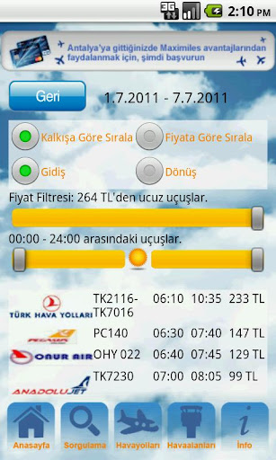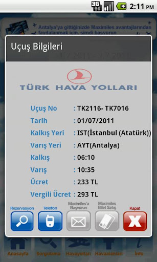 Uçak Bileti Uygulaması, Türkiye'nin ilk yurtiçi mobil uçak arama motorudur. Uçak Bileti uygulaması ile tüm iç hat uçuşları karşılaştırmalı olarak; anlık güncel bilet fiyatlarıyla görüntülenebilmektedir. Sorgulama sonuç sayfası üzerinde bilet satın alma veya rezervasyon için havayollarını direk arayabilir veya havayolu firmalarının satın alma ekranlarına geçip işlemlerinizi devam ettirebilirsiniz.