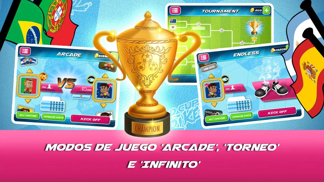 ¡Únete a las celebraciones y compite por la gloria del torneo en divertidos y rápidos partidos de uno contra uno!¡La fiebre del fútbol se apodera de las calles de Brasil! Dispara, remata de cabeza y has entradas con los mejores equipos del mundo. ¡Cada uno tiene sus propios disparos especiales increíblemente divertidos y espectaculares!